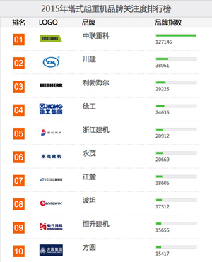 榜單是基于2015年中國路面機械網及工程機械電商網海量用戶對其平臺內所有塔式起重機品牌、產品的瀏覽及在線詢價次數而生成的。該榜單能在一定程度上體現行業用戶對品牌及產品的偏好,同時在一定范圍內反映企業品牌和產品在用戶群體中的影響力和覆蓋程度。