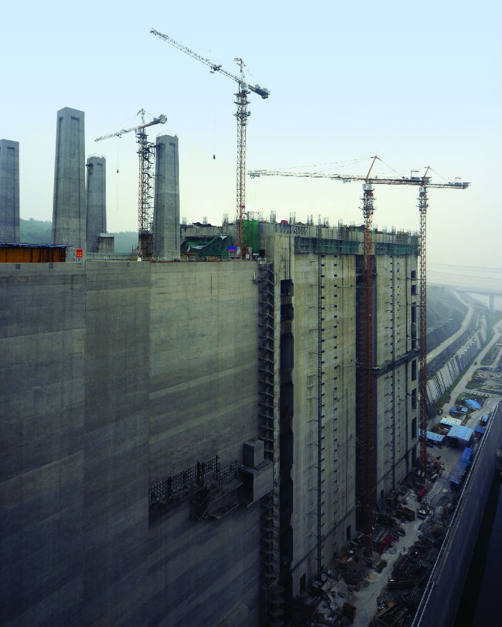 在此次升船機建設施工中,使用了川建2臺C7030和2臺F0/23B塔機,用于升船機壩體澆筑,鋼筋、模板吊裝等作業(yè)。另有4臺川建SC系列施工升降機用于施工人員的運送及施工物品的裝載。其中C7030塔機最大起重力矩274噸米,最大起重量16t,端部吊重3t,工作幅度70米,2臺塔機均固定附著式,附著在升船機壩體,附著高度達到185米。F0/23B塔機為標準高度的行走式,最大起重力矩132噸米,最大起重量10t,端部吊重2.3t,工作幅度50米。而4臺施工升降機均為SC200/200W,使用了德國先進的SEW施工升降機專用電機減速器,其單籠功率為3×11kW,并采用變頻控制,PLC邏輯處理,通過采集操作運行中的各種信號進行綜合邏輯分析,使升降機的運行更為平穩(wěn)、安全可靠。吊籠尺寸為3×1.5×2.7米,、便于體積較大物料運輸。川建升降機均對吊籠、標準節(jié)、附墻等結構進行了大量的優(yōu)化設計,使得結構更加合理、整機更加安全可靠。