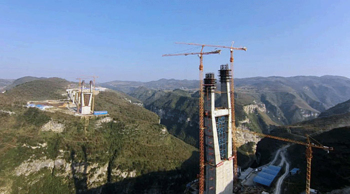 六廣河特大橋是息黔高速公路最為重要,同時也是施工難度最大的控制性工程,兩側橋墩高度均為242米,每個橋墩的起重機械配置均為川建生產的兩臺C7030塔機和兩臺SC200/200WPZ中速變頻施工梯。